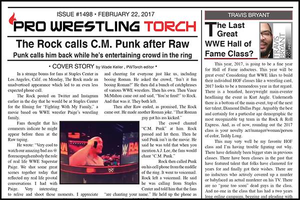 VIP NEWSLETTER – PRO WRESTLING TORCH #1498 (Feb. 22, 2017) – Keller’s editorial on this being a transitional WrestleMania year, Parks breaks down Festival of Friendship, Bryant says this could be last great HOF class, cover story on Rock at Raw, more