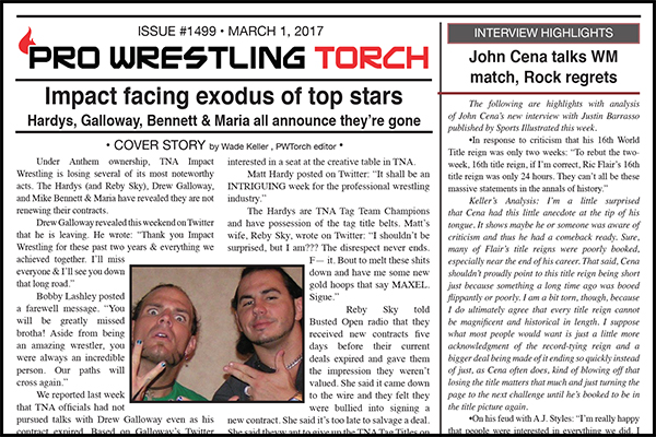 SUMMARY: This week’s PWTorch Newsletter begins with Wade Keller’s cover story detailing the exodus of wrestlers from TNA this week… Keller’s Interview Analysis reads between the lines on John Cena’s SI interview… Bruce Mitchell’s column looks at the Hardys… Greg Parks’ column proposes Raw-Smackdown trades… Plus Torch Newswire, Ringside Beat house show reports, Raw and Smackdown reports…