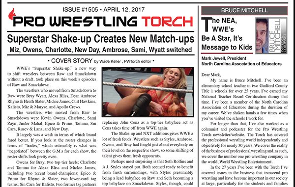 SUMMARY: This week’s PWTorch Newsletter begins with Wade Keller’s overview of the Superstar Shake-up on Raw and Smackdown. Keller’s back page editorial presents a Raw depth chart after the Shake-up… Bruce Mitchell’s feature column presents a point of view on the Mauro-JBL situation and WWE’s “Be a Star” hypocrisy from the perspective of an elementary school teacher… Greg Parks presents his annual WrestleMania 33 fashion report… Plus Torch Newswire, Ringside Beat, Keller’s NXT Takeover Orlando report, Keller’s Raw Report, and Keller’s Smackdown Report…