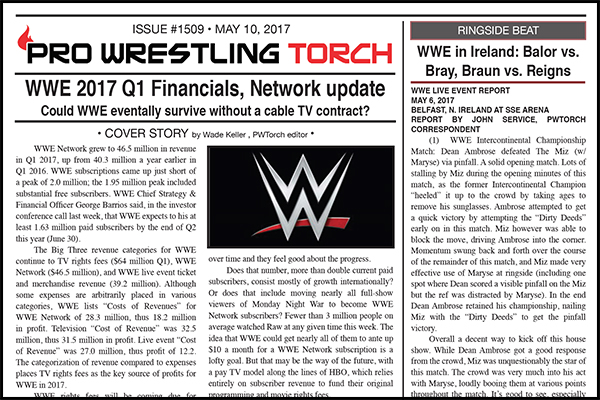 SUMMARY: This week’s PWTorch Newsletter begins with Wade Keller’s cover story on the latest WWE Financials including the latest take on WWE Network growth and possible changes way down the line with how WWE reaches new fans… Columns from Bruce Mitchell (on the NWA name and how nostalgia changes and fades), Greg Parks (an interview with the author of a Vince McMahon movie), and Travis Bryant (on the elusive cool factor in pro wrestling and four wrestlers who have it now)… Wade Keller’s End Notes on a variety of topics… Keller’s Raw and Smackdown reports… Torch Newswire… Ringside Beat reports from WWE, NXT, and ROH live events… And more…