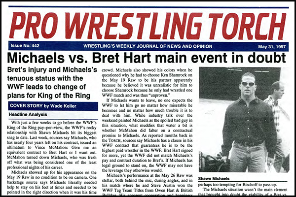 SUMMARY of #442 cover-dated May 31, 1997: This issue begins with a cover story on the latest drama with Shawn Michaels behind the scenes in the WWF that put a Bret Hart vs. Michaels match in doubt… Part two of the Disco Inferno (Glen Gilbertti) “Torch Talk” with his frustrations with WCW… Wade Keller’s BBL feature editorial looking at the increasing sophistication and depth to the WWF’s characters and a prediction of it helping the company in the late-1990s… Plus Letters to the Torch, Wade Keller’s End Notes, WWF Newswire, WCW Newswire, ECW Newswire, ETC. Newswire, and reports on Raw, Nitro, ECW TV…