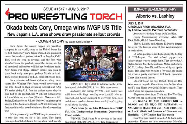 SUMMARY: This week’s PWTorch Newsletter begins with a cover story on the New Japan debut in the United States over the weekend in Long Beach, Calif. and a detailed report on GFW Impact’s Slammiversary PPV event. Then exclusive columns from Greg Parks on GLOW, Bruce Mitchell on his discovery of what Smackdown’s new theme is, and Travis Bryant’s pitch for the upside of the Titus Worldwide brand. Plus Keller’s Raw and Smackdown reports.