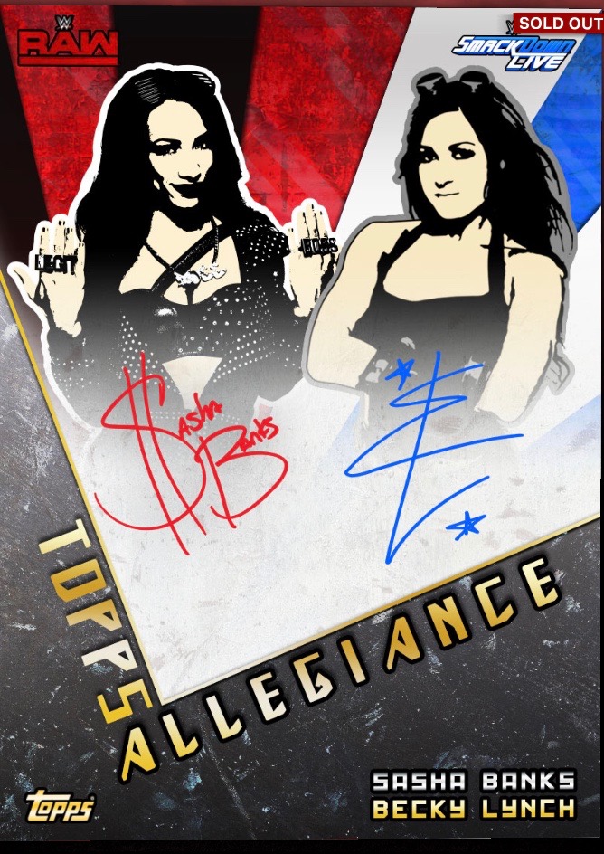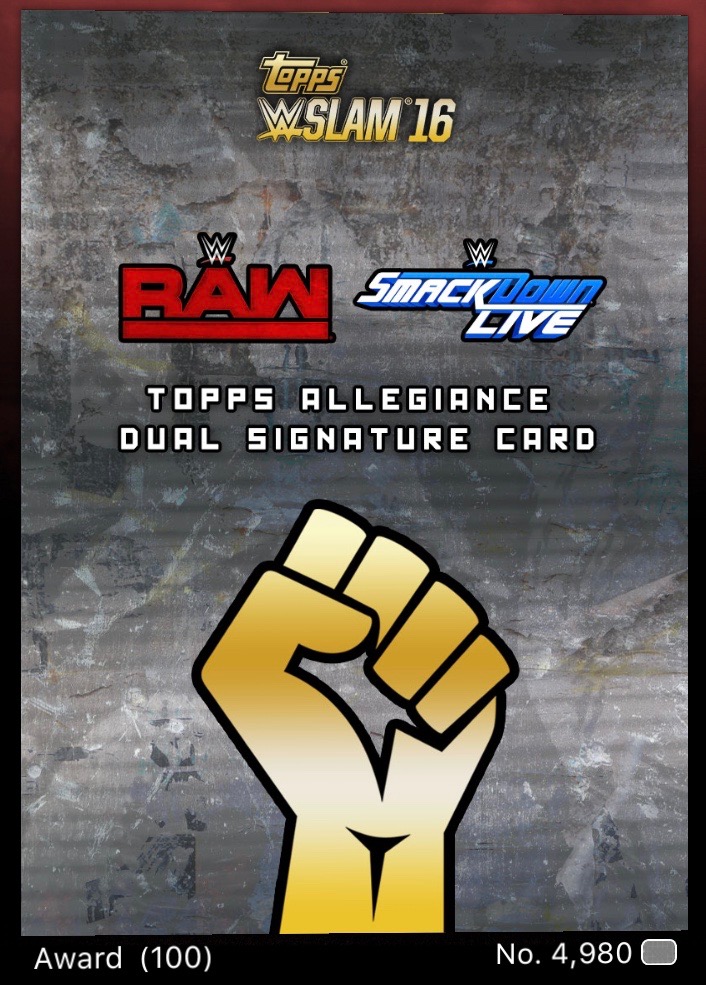 There is a concept called “coin path” where a set of cards is released with increasingly higher odds in packs, you get easy odds for card #1, and can’t pull any others until you pull that one. Then the odds go up for card #2 and so on until you hit the final card. This is the concept that Topps introduced to slam with Allegiance. The idea was you had to choose either Raw or Smackdown as your “brand” and then you tried to get all the cards in the brand to get an award. If you managed to do it with both brands then you got a bonus award.