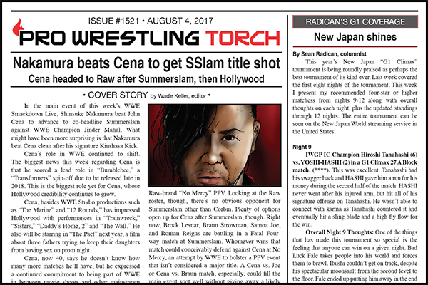 SUMMARY: This week’s PWTorch Newsletter begins with Wade Keller’s cover story on John Cena’s big news week, from losing to Shinsuke Nakamura to plans for him to wrestle on Raw to his biggest movie role yet and what it could all mean to WWE and Cena… Ringside Beat features in-depth correspondent reports from WWE and NXT live events… Wade Keller’s End Notes with the Top Ten Opponents John Cena should still wrestle before retiring… Bruce Mitchell’s column presents ideas for WWE to cut costs… Greg Parks’s column presents ideas to expand the WWE tag team division… Keller’s WWE Raw and Smackdown reports… Torch Newswire… And Sean Radican’s coverage of the New Japan G1 tournament nights 9-12…