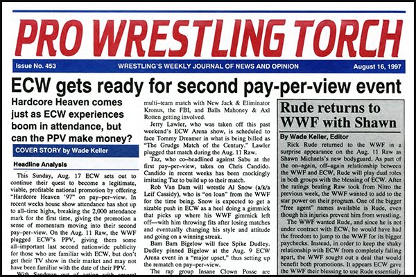 SUMMARY of #453 cover-dated August 16, 1997: This issue headlines with a preview of ECW’s second PPV, Hardcore Heaven… A Cover Sidebar details Rick Rude’s return to WWE with Shawn Michaels… WWF Newswire updates the possible end of Steve Austin’s in-ring career… WCW Newswire details Hulk Hogan’s extortion lawsuit… WCW Road Wild PPV coverage including Keller’s match report with star ratings, Roundtable Reviews, Reader Reax, and Poll Results… Plus, reports on Raw, Nitro, ECW TV, USWA TV, Wade Keller’s “End Notes,” ECW Newswire, ETC. Newswire, a detailed ECW Arena report, and more…