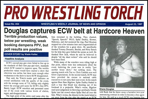 SUMMARY of #454 cover-dated August 23, 1997: This issue headlines with a cover story analysis of ECW’s second-ever PPV – Hardcore Heaven ’97. Included is Wade Keller’s match report with star ratings, extensive reader reaction, and PPV poll results, plus a feature column by John Williams grading the PPV in various categories… The big story of the week was in WCW Newswire – the beginning of the end of WCW – as Thunder was added to the schedule from pressure from TBS wanting to get in on the ratings bonanza that was happening on Monday nights. Meanwhile, on the opposite page, as WWF Newswire reported a trend of rising ratings for Raw, another sign that the timing as all wrong for a WCW expansion… Plus reports on Raw, Nitro, ECW TV, USWA TV, ECW Newswire, ETC. Newswire…
