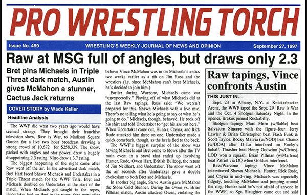 SUMMARY of #459 cover-dated September 27, 1997: This issue headlines with a cover story Raw at MSG drawing only a 2.3 despite a ton of angles… Bruce Mitchell’s feature column looks at the late Fritz Von Erich’s controversial legacy… Expanded Letters to the Editor plus Wade Keller’s “End Notes” looks at the Horsemen spoof by the NWO… Plus WCW Newswire, WWF Newswire, ECW Newswire, ETC. Newswire, reports on Raw, Nitro, ECW TV, and the USWA, an ECW Arena Report, and more…