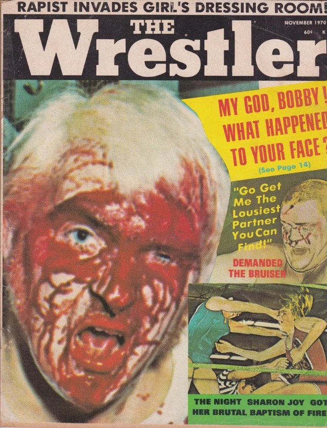Heenan’s likeness has been a moneymaker since as far back as the 1960s, when newsstand wrestling magazines would use his bloodied face to sell magazines. One particularly grotesque cover can be found on the November 1970 issue of The Wrestler, with the headline, “My God, Bobby! What Happened to Your Face?” The October 1975 issue of Inside Wrestling features a similar gory picture, with the headline, “Bobby Heenan Isn’t Safe Anywhere.” These “bloody Bobby Heenan mags,” as they’ve come to be known, are still popular with collectors today. Copies in decent shape usually sell for about $20, with signed copies fetching around $50.