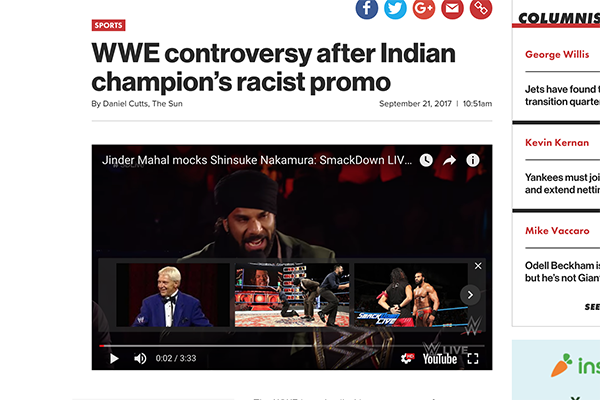 In story published by the New York Post, a WWE statement was included regarding some backlash against Jinder Mahal’s race-targeted mocking of his opponent at WWE Hell in a Cell next month, Shinsuke Nakamura.