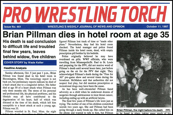SUMMARY of #461 cover-dated October 11, 1997: This issue headlines with a cover story on the death of Brian Pillman, plus Letters to the Editor with reader thoughts… WWE IYH Badd Blood coverage including Keller’s match report with star ratings, Roundtable Reviews, and Reader Reax… Keller’s End Notes reacting to Jim Cornette’s rant and analysis of how Vince McMahon handled Pillman’s death on Raw… Plus WCW Newswire, an expanded WWF Newswire, ECW Newswire, ETC. Newswire, reports on Raw, Nitro, ECW TV, a WWF Arena Report, and more…