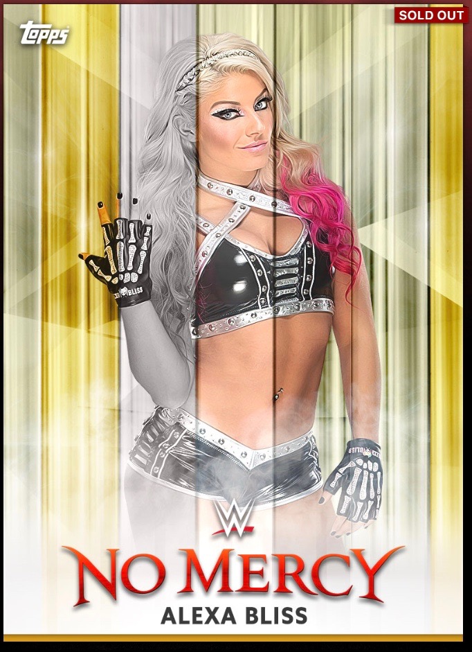 No Mercy was a traditional PPV set focusing on the Raw roster this year (for the record No Mercy was a SDL show last year). A 19 card roster came with 3 variants, “black”, red and purple. Purple were paywalled and limited to 500cc. Naturally they sold out quickly. The signature set was three cards and about as pedestrian as you can get, Nia Jax, Emma and John Cena. None of these set the game on fire. The only thing that was actually interesting is that if you collected all five of the card bundle incentive golds you were awarded with a gold Alexa Bliss base variant, which ended up with 60cc. It is her 2nd shortest print single in the game (she’s on a dual sig with Becky Lynch from TLC that is 30cc). Her shortest print is the 2016 lime green snafu card.