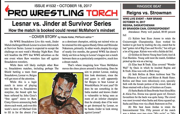 SUMMARY: This week’s PWTorch Newsletter begins with Wade Keller’s cover story on the Jinder Mahal vs. Brock Lesnar match at Survivor Series… Keller’s reports on NXT, Raw, and Smackdown… Greg Parks feature column on what has stopped Lucha Underground’s buzz through three seasons… Plus Torch Newswire, Ringside Beat, and more…