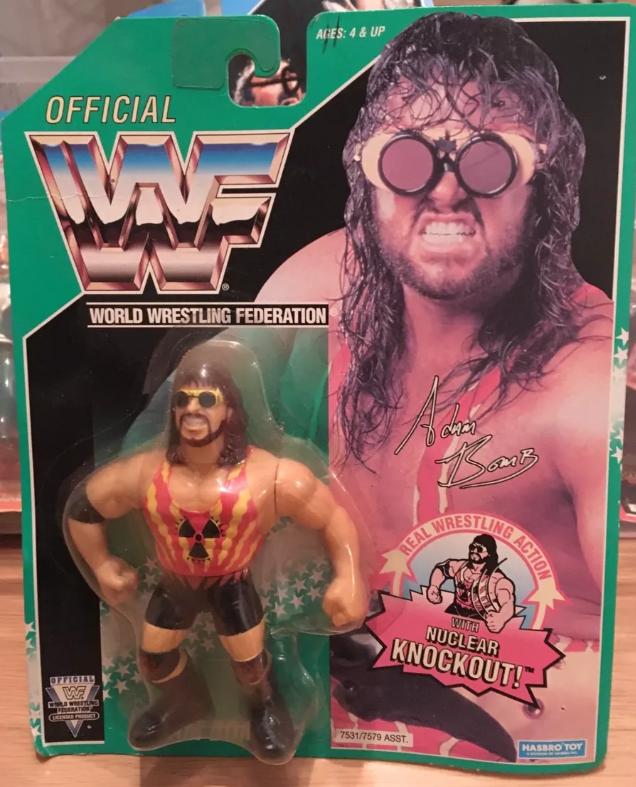 - Adam Bomb Hasbro WWF Series 11. As the Night Stalker, Bryan Clark worked a handful of WWF house shows as a vampire character in 1993. By the time he made it to television, the Night Stalker had become Adam Bomb, a survivor of the Three Mile Island nuclear accident in 1979. He wore yellow contact lenses and used 1950s creature feature music straight out of “It Came from Outer Space.” Hasbro included a great figure of Adam Bomb in its 11thand final series of WWF action figures, which were packaged on green cards. These green card figures are incredibly rare, and Adam Bomb is one of the most popular in the set.