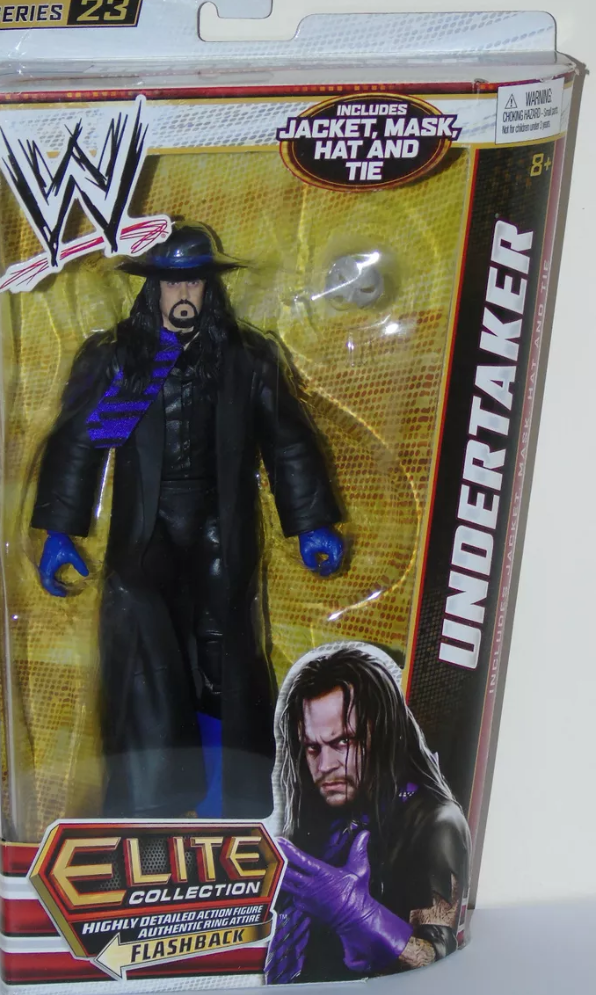 - Undertaker Mattel WWE Elite Series 23 Flashback. Throughout his career the Undertaker has portrayed several different horror characters, most notably a zombie and the leader of a Satanic-like cult. In 1995, King Mabel dropped a big leg on the Undertaker, crushing bones in his face. Undertaker returned with a new Phantom of the Opera-esque mask. Mattel produced a great looking figure of this version of the Undertaker, complete with removable mask, coat and hat.