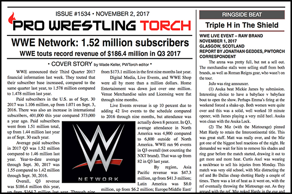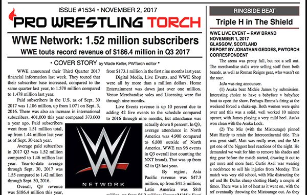 SUMMARY: This week’s PWTorch Newsletter begins with Wade Keller’s cover story on WWE Financials and an End Notes editorial on one key takeaway regarding what would trigger real growth (maybe the only thing on the horizon)… Greg Parks’s feature column on William Regal’s wisdom on Twitter, part two of two… Bruce Mitchell’s Wrestling Observer Hall of Fame Ballot… Ringside Beat, Torch Newswire, Keller’s Raw and Smackdown reports… And more…