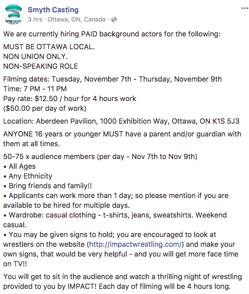 According to a post by the Smyth Casting Agency, Impact Wrestling is paying up to $50 per day for “extras” to appear in the crowd at this week’s Impact tapings in Ottawa. Smyth Casting is searching for 50-75 audience members per day. A post on the company’s Facebook page (see below) says that audience members may be given signs to hold, but they’re also encouraged to bring their own signs.