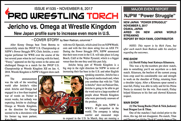 SUMMARY: This week’s PWTorch Newsletter begins with Sean Radican’s cover story on the New Japan blockbuster announcement of a Chris Jericho vs. Kenny Omega match at Wrestle Kingdom… Bruce Mitchell’s column on the Jericho-Omega dream match… Greg Parks tracks wrestlers today and their trainers… Wade Keller’s in-depth Impact Wrestling Bound for Glory PPV report… Rich Fann’s New Japan Power Struggle report… Keller’s Raw & Smackdown reports… More…