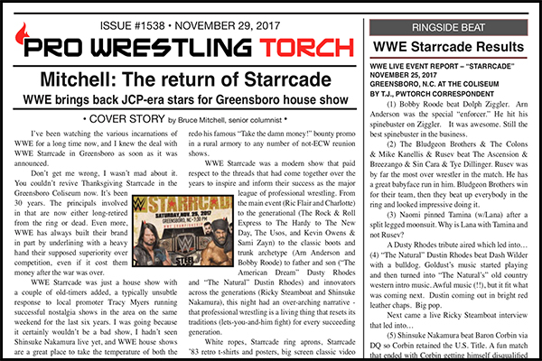 SUMMARY: This week’s PWTorch Newsletter begins with Bruce Mitchell’s cover story on his Starrcade experience in Greensboro last weekend… Ringside Beat includes a Starrcade house show report… Torch Newswire coverage of the news of the week including Cody & Young Bucks planning to run a big show… Keller’s newsletter-exclusive NXT TV report, plus Raw and Smackdown reports… Greg Parks’s column on the highs and lows of the Survivor Series elimination tag matches over the decades… Mitchell’s column on a Dream Match No More in WWE… Keller’s End Notes makes the case for Roman Reigns’ great potential as a heel and key factors that play uniquely into why he’d be such a big draw in that role…