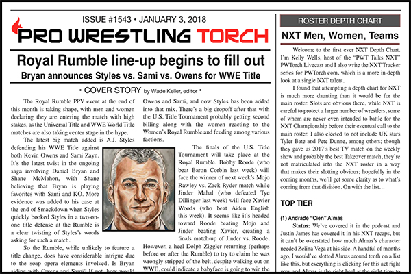 SUMMARY: This week’s PWTorch Newsletter begins with Wade Keller’s early Royal Rumble preview as the top matches take shape… Kelly Wells’s NXT Roster Depth Chart… Greg Parks’s column presents the 2017 Parksy Awards… Keller’s newsletter-exclusive NXT TV Report, plus his reports on Raw and Smackdown… Ringside Beat reports… More…