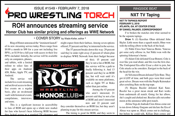 SUMMARY: This week’s PWTorch Newsletter includes Keller’s cover story on ROH’s new streaming service including our PWTorch poll results on interest level… Ringside Beat house show reports and from WWE and NXT plus full NXT TV taping results… Torch Newswire… Keller’s reports on Raw and Smackdown… Greg Parks’s feature column picking out matches to watch on WWE Network’s new release of vintage Coliseum Home Videos… A special ROH Roster Depth Chart feature… Keller’s End Notes talking about Rusev Day…