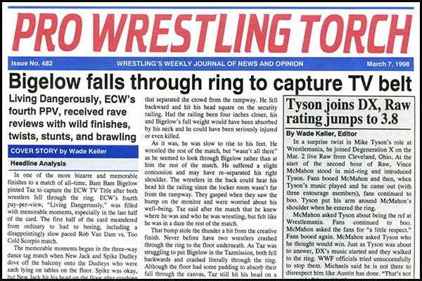 SUMMARY of #482 cover-dated March 7, 1998: This issue headlines with a cover story on Bam Bam Bigelow falling through the ring in a big stunt on PPV… A cover sidebar details Mike Tyson joining DX and popping a rating for Raw… In-depth coverage of the ECW Living Dangerously PPV event including Keller’s match report with star ratings, Roundtable Reviews, Reader Reax, and Poll Results… WWF, WCW, ECW, and ETC. Newswires look at the news of the day with backstage items along with the headlines… Plus reports on Raw, Nitro, Thunder, ECW TV, Letters to the Editor, and a WWF Arena Report with Austin vs. Triple H…