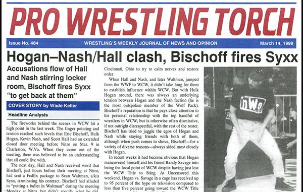 SUMMARY of #484 cover-dated March 14, 1998: This issue headlines with a cover story on the remarkable, much-talked-about-since incident where Eric Bishoff fired Syxx (Sean Waltman) because Scott Hall and Kevin Nash upset him… Detailed report on Vince McMahon’s interview on TSN, plus Keller’s “End Notes” analyzes his answers… Keller’s “This Week” feature column proposes that Shawn Michaels would be passing the torch to Steve Austin at WrestleMania 14… In-depth ECW Live Event Report from Brockton, Mass… WWF, WCW, ECW, and ETC. Newswires look at the news of the week with backstage items along with the headlines… Plus reports on Raw, Nitro, Thunder, ECW TV, and Letters to the Editor…
