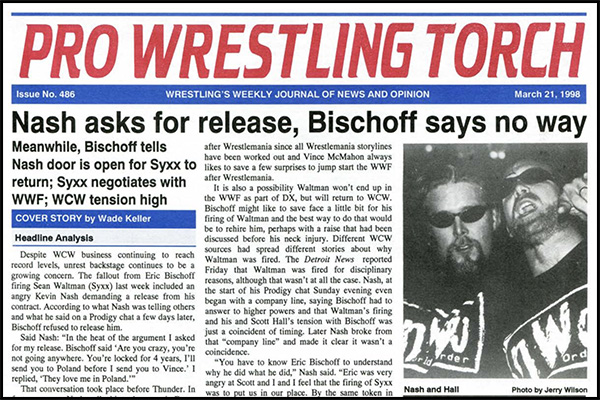 SUMMARY of #486 cover-dated March 21, 1998: This issue headlines with a cover story follow-up on Syxx (Sean Waltman) being fired by Bischoff, with Eric Bischoff saying door is open for Syxx to return; meanwhile, Kevin Nash asks for his release and Bischoff says no way… Details of the Prodigy chat with Nash speaking out about the Waltman firing… In-depth WCW Uncensored PPV coverage including Keller’s match report with star ratings, Roundtable Reviews, and Reader Reax… WWF, WCW, ECW, and ETC. Newswires look at the news of the week with backstage items along with the headlines… Plus reports on Raw, Nitro, Thunder, ECW TV, and an ECW live event report…