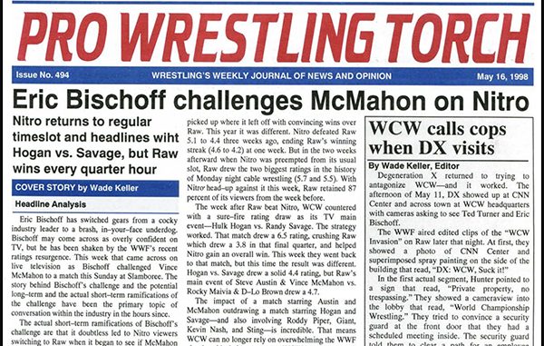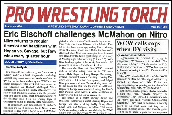 SUMMARY of #494 cover-dated May 16, 1998: This issue headlines with a cover story on Eric Bischoff challenging McMahon on Nitro and a cover sidebar on WCW calling cops on DX paying them a visit… Part three of the “Torch Talk” with Sean Waltman detailing behind the scenes details on WCW and Eric Bischoff’s management style during the Nitro years… Chris Zavis’a feature column on a survey of a target group of fans… Plus reports on Raw, Nitro, ECW, and Thunder, Torch Newswire with backstage news from all over, Keller’s End Notes, WCW Arena Spotlight, WWF Arena Spotlight, and more…