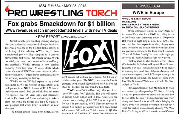 SUMMARY: This week’s PWTorch Newsletter includes Wade Keller’s cover story on WWE’s huge TV deals that change the landscape of WWE for the next half decade… Bruce Mitchell’s feature column the WWE’s Old Problems vs. New Problems with this new TV deal… Greg Parks’s column reviews WWE Network’s non-in-ring content worth seeking out… Plus WWE live event reports from Europe, Keller’s Raw & Smackdown reports, Torch Newswire, and more.