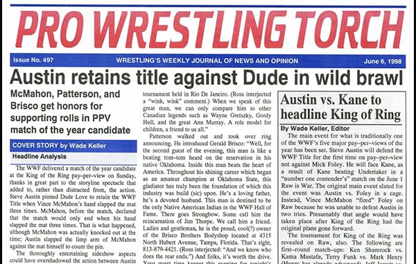 SUMMARY of #497 cover-dated June 6, 1998: This issue headlines with a cover story on the Match of the Year contender between Steve Austin vs. Dude Love (Mick Foley) at the WWF Over the Edge PPV. Also, Keller’s in-depth match report with star ratings, Roundtable Reviews, Reader Reax, and Poll Results… Plus reports on Raw, Nitro, Thunder, and ECW, WCW Newswire (detailing Raw’s crushing shocking win over Nitro that week), WWF Newswire, ECW Newswire, ETC. Newswire, and more…