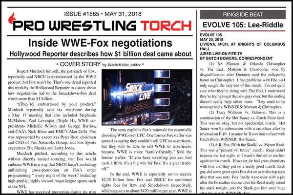 VIP NEWSLETTER – PRO WRESTLING TORCH #1565 (May 31, 2018) – More on WWE-Fox deal including Keller on ramifications industry-wide, Parks column on pros and cons of MITB winners, Keller’s reports on NXT, Raw, and SD, more