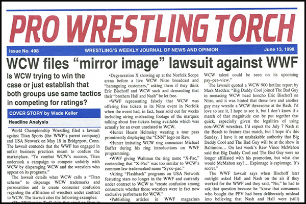 SUMMARY of #498 cover-dated June 13, 1998: This issue headlines with a cover story on the “mirror image” lawsuit filed by WCW against the WWF that had major parallels with WWF’s lawsuit against WCW… Wade Keller’s BBL feature editorial looks at the Falacies that Ruled (and Destroyed) WCW… ECW Arena report in depth including Al Snow lashing out at ECW fans… WWF Newswire includes JYD death coverage… WCW Newswire includes details on Goldberg vs. Hulk Hogan scheduled… Plus reports on Raw, Nitro, Thunder, and ECW, ECW Newswire, ETC. Newswire, Letters to the Editor, Wade Keller’s End Notes on Nitro, and more…