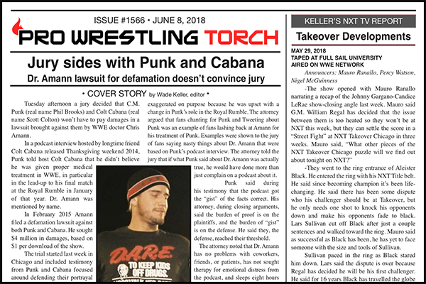 SUMMARY: This week’s PWTorch Newsletter includes Wade Keller’s cover story on the C.M. Punk/Colt Cabana court victory over Dr. Amann from WWE… Bruce Mitchell’s column on his pet peeves about use of the term “mark” and “smark”… Greg Parks’s column on the pro and cons of various possible winners of the Women’s Money in the Bank match… Keller’s End Notes editorial on two people other than A.J. Styles and Daniel Bryan who Shawn Michaels should consider for a possible comeback match… Keller’s reports on NXT TV, Raw, and Smackdown… Torch Newswire… And more…