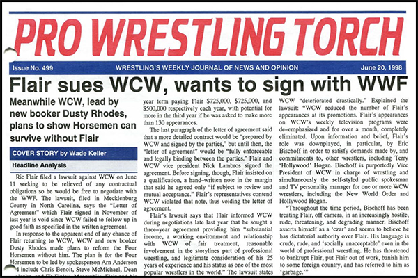 SUMMARY of #499 cover-dated June 20, 1998: This issue headlines with a cover story detailing Ric Flair’s lawsuit against WCW… WCW Newswire features details on WCW’s new booker Dusty Rhodes plans to counter the Flair lawsuit creatively, plus an update on Hulk Hogan’s status… WWF Newswire details Shawn Michaels’s return to a WWF event for the first time in months, plus Raw ratings winning streak continues… In-depth coverage of the WCW Great American Bash with Keller’s match report with star ratings, Roundtable Reviews, Reader Reax, and Poll Results… Plus reports on Raw, Nitro, Thunder, and ECW, ECW Newswire, ETC. Newswire, Letters to the Editor, Wade Keller’s End Notes on Lawsuits, WWF Arena Spotlight, and more…