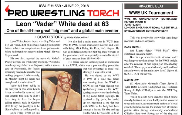 SUMMARY: This week’s PWTorch Newsletter includes Wade Keller’s cover story the death of Leon “Vader” White… Money in the Bank staff PPV Roundtable Reviews… Keller’s End Notes editorial on the rise in pro wrestling content in the United States including AXS and New Japan… An expanded Torch Newswire… Ringside Beat reports on the WWE UK Tournament… Greg Parks’s feature column looks at possible routes for the WWE world titles on road to Summerslam… Keller’s NXT TV report… Lucha Underground season 4 premiere including producer Chris DeJoseph interview highlights…
