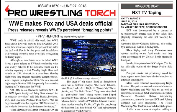 SUMMARY: This week’s PWTorch Newsletter includes Wade Keller’s cover story on WWE’s official announcement regarding the new TV deals on Fox and USA… Keller’s End Notes dissects the pop-culture icons list in the WWE press releases plus what the new TV deals mean to wrestlers and fans… Greg Parks’s column examines New Japan’s aspirations to expand in the U.S… Bruce Mitchell’s column reacts to the counter-productive Bobby Lashley-Roman Reigns exchange on Raw on Monday… Plus Torch Newswire, Ringside Beat (including NXT TV tapings and EVOLVE 107, Keller’s Raw and Smackdown Reports, and a 20 Years Ago Snippet…