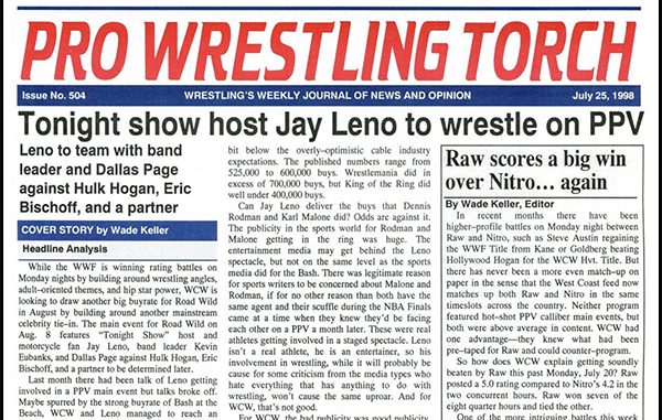 SUMMARY of #504 cover-dated July 25, 1998: This issue headlines with a cover story on the Tonight Show’s Jay Leno agreeing to wrestle on a WCW PPV… Also a cover sidebar on Raw scoring another big ratings win over Nitro… Torch Talk with Sean Waltman, pt. 6, includes his take on the controversial Four Horsemen spoof on Nitro he participated in… A detailed ECW Arena report… Letters to the Editor responding to Bruce Mitchell’s “Meat Puppets” column… Plus reports on Raw, Nitro, Thunder, and ECW, WCW Newswire, WWF Newswire, ECW Newswire, ETC. Newswire, Wade Keller’s End Notes on Nitro and Raw, and more…