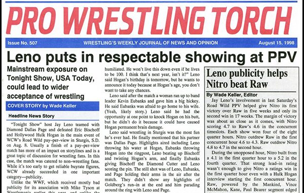 SUMMARY of #507 cover-dated August 15, 1998: Features cover story on Jay Leno’s respectable showing in a match at the WCW Road Wild PPV, a sidebar cover story on Leno’s affects on Raw-Nitro ratings, Newswire coverage of the WWF, WCW, ECW, and the Indy Scene with backstage insider news from that week, detailed Torch coverage of the Road Wild PPV with Leno & DDP vs. Eric Bischoff & Hollywood Hogan, and a detailed ECW Arena Report with Sabu & RVD vs. The Dudleys in the main event plus Lance Storm, Spike Dudley, Chris Candido, Jerry Lynn, Masato Tanaka, Mike Awesome, Bam Bam Bigelow, Sabu, Taz, Justin Credible, Nicole Bass, Sandman , and more…