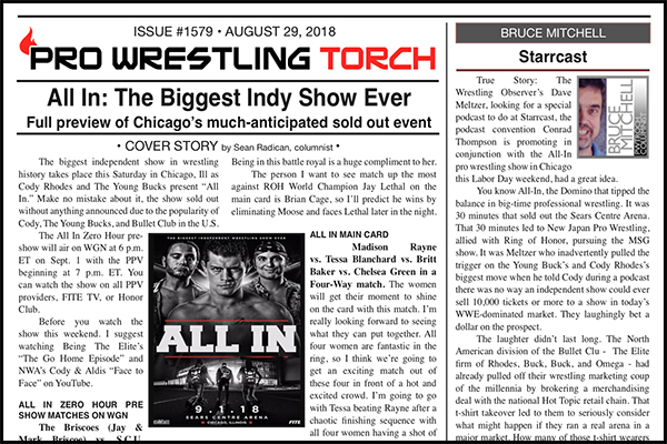 SUMMARY: This week’s PWTorch Newsletter includes Sean Radican’s cover story previewing All In’s entire line-up… Bruce Mitchell’s column on “Starrcast”… Greg Parks evaluates the latest batch of NXT call-ups and how they are faring on the main roster… Newsletter-Exclusive PPV Roundtable reviews on NXT Takeover Brooklyn and WWE Summerslam… Keller’s Raw and Smackdown reports… TV taping reports from NXT and NXT UK… And more…