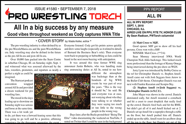 SUMMARY: This week’s PWTorch Newsletter includes Wade Keller’s cover story on All In and Starrcast weekend with a big picture look at what it means and symbolized with behind the scenes observations and anecdotes that helped define that… Sean Radican’s match report with star ratings on All In… Greg Parks’s feature column on All In… Keller’s reports on Raw and Smackdown… Torch Newswire… Ringside Beat report on the WWE house show in Shanghai with John Cena… And more…