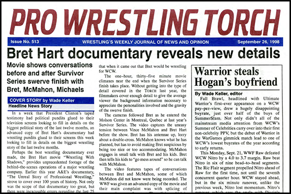 SUMMARY of #513 cover-dated September 26, 1998: This issue features in-depth coverage of the Bret Hart documentary “Wrestling With Shadows” including Wade Keller’s expanded Cover Story analyzing new things learned from the movie and Bruce Mitchell’s feature column looking at the documentary. Also: Wade Keller’s feature editorial looking at the need for the WWF to keep feeding Steve Austin strong opponents in order to keep him hot, a cover sidebar story titled “Warrior Steals Hogan’s Boyfriend,” a detailed ECW Arena report, full-length WWE Newswire, WCW Newswire, ECW Newswire, ETC. Newswire, and coverage of that week’s Raw vs. Nitro battle…