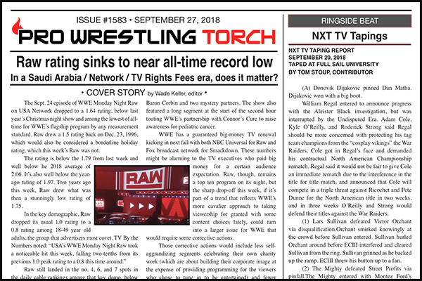 SUMMARY: This week’s PWTorch Newsletter includes Wade Keller’s cover story on WWE’s historic low rating for Raw this week and what it means and doesn’t mean… Greg Parks’s feature column looking sat Ring Warriors on WGN… Sean Radican’s New Japan Destruction report including Kenny Omega vs. Iishi… Keller’s End Notes on Hulk Hogan and Brock Lesnar… Plus Keller’s reports on Raw and Smackdown, Torch Newswire, Ringside Beat, and more…