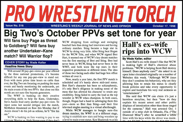 SUMMARY of #516 cover-dated October 17, 1998: This issue features a Cover Story on WCW and WWF upcoming PPVs including analysis of whether Goldberg vs. Dallas Page and Undertaker vs. Kane would draw… Scott Hall’s ex-wife rips into WCW… Detailed ECW Arena report including Bam Bam Bigelow, Lance Storm, Rob Van Dam, Sabu, Tommy Dreamer, The Dudleys, Jerry Lynn… TV reviews of Raw, Heat, Nitro, Thunder, ECW, Power Pro… Plus a Japan wrestling column by Chris Zavisa, Letters to the Editor, and End Notes with Wade Keller…