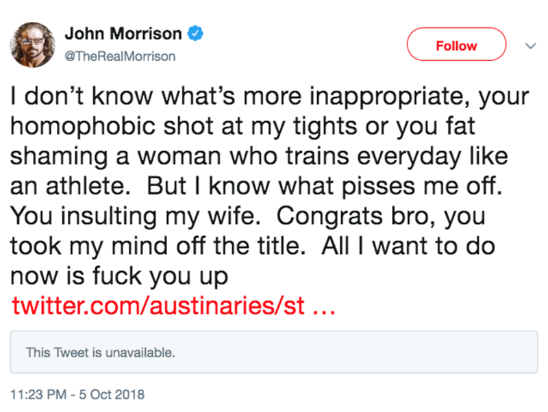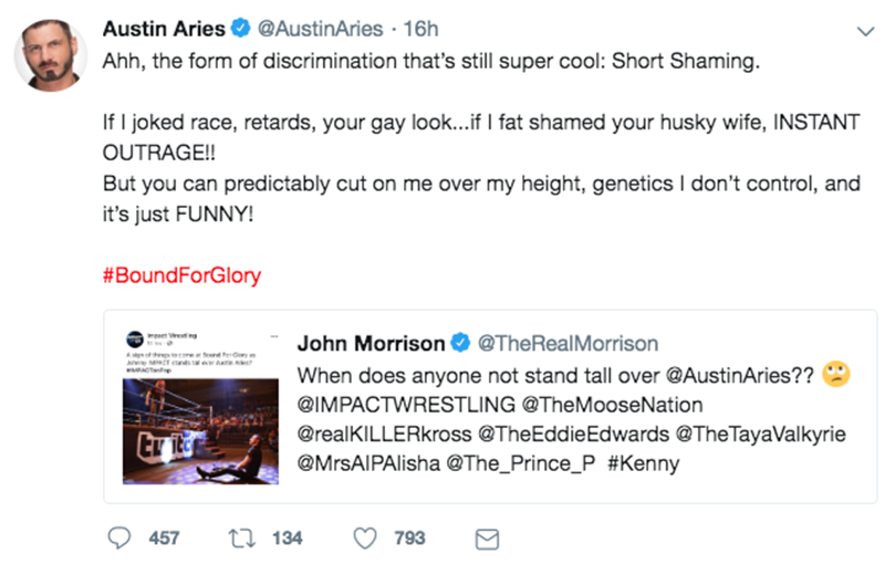 The PPV match between Austin Aries and Johnny Impact just got a little more interesting. This all started when Aries called out Johnny for short-shaming him; then it quickly escalated. Taya Valkyrie (Johny’s wife) was mentioned which let to exchange below.
