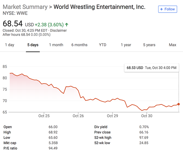 WWE stock in the last five days has tumbled from $82.05 to $68.53 as of this afternoon. Over the last 30 days, covering the entire time of this controversy and also the 2018 Q3 financial release, WWE stock is down from $25.69 from an Oct. 1 start of $94.22
