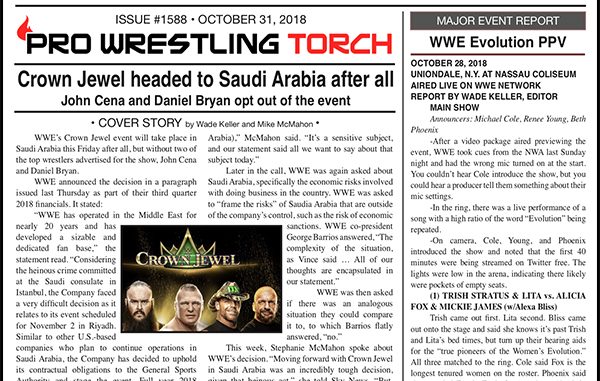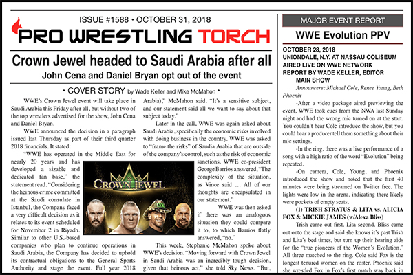 SUMMARY: This week’s PWTorch Newsletter includes Wade Keller’s Cover Story on WWE bringing Crown Jewel to Saudi Arabia after all, but without John Cena and Daniel Bryan… Greg Parks takes a look at Lucha Underground headed into Ultima Lucha Cuatro… Keller’s WWE Evolution PPV report and Staff Roundtable Reviews… Torch Newswire… Keller’s Raw and Smackdown reports…