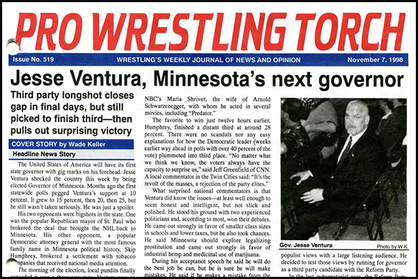 SUMMARY of #519 cover-dated November 7, 1998: This issue features coverage of Jesse Ventura being elected governor of Minnesota… A detailed report on the ECW November to Remember PPV including Torch reader reaction, poll results, and Torch PPV Roundtable… Extended length WWF, WCW, and ECW Newswire reports including detailed coverage of growing tension between Steve Austin and Vince McMahon behind the scenes… Detailed coverage of Raw, Nitro, Heat, Thunder, ECW TV… End Notes with Wade Keller…