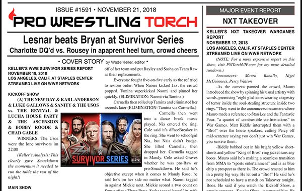 SUMMARY: This week’s PWTorch Newsletter includes Wade Keller’s reports on WWE Survivor Series, NXT Takeover, Raw, Smackdown… Greg Parks column on WWE’s babyface challenges and Bruce Mitchell column on Ronda Rousey… And more.