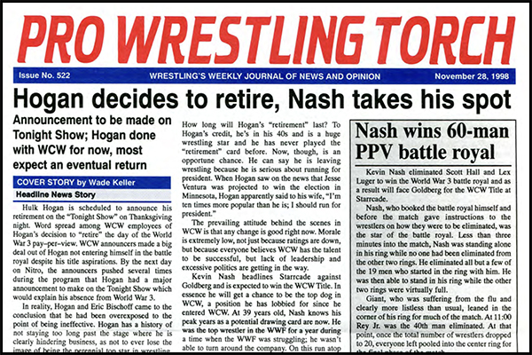 VIP 1998 BACK ISSUE – Pro Wrestling Torch #522 (November 28, 1998): WCW World War III PPV coverage, Cover Story detailing Hulk Hogan’s “retirement” from WCW, Keller editorial on the games being played by his heir apparent Kevin Nash, more