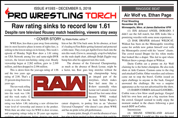 VIP NEWSLETTER – PRO WRESTLING TORCH #1593 (December 6, 2018) – Cover Story Sinking Raw Ratings, Keller editorial on sparking Raw, Parks column on last week’s awful Raw, Newswire, Mitchell column